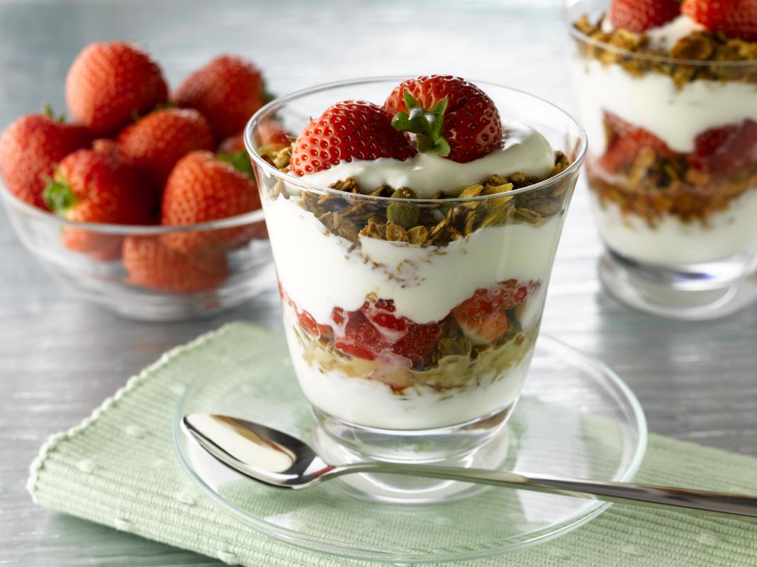 Завтрак: Овсянка с ягодами и орехами, омлет с овощами, йогурт с фруктами и гранолой.