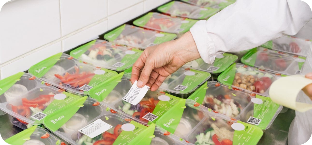 Процесс упаковки и маркировки занимает не более 15 секунд: в запайщик вставляются контейнеры, машины пускает пищевой газ и запаивафет сверху пленкой. Вся продукция промаркирована датой и временем изготовления, а также описанием